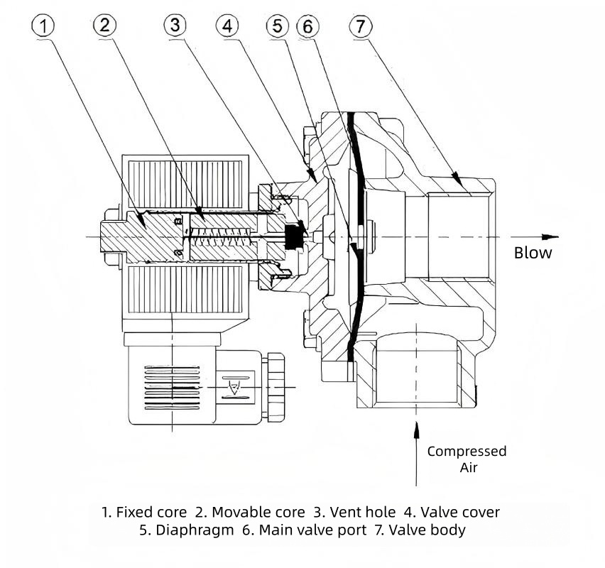 Βασικά εξαρτήματα: Περιλαμβάνει ηλεκτρομαγνητική κεφαλή, διάφραγμα, σώμα βαλβίδας και ελατήριο. Το σώμα της βαλβίδας είναι κατασκευασμένο από κράμα αλουμινίου, ενώ το διάφραγμα τυπικά διαθέτει δομή ενισχυμένη με ύφασμα από καουτσούκ νιτριλίου, προσφέροντας αντοχή στη φθορά και υψηλή απόδοση στεγανοποίησης.